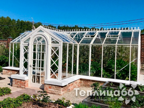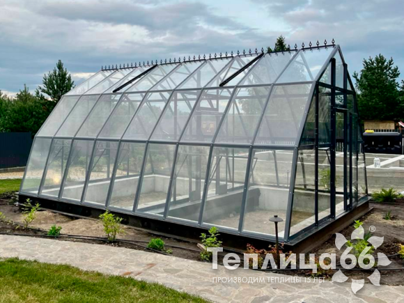 Это теплица премиум класса, изготовленная из поликарбоната, собранная на алюминиевом каркасе, которая пользуется высоким спросом на рынке.